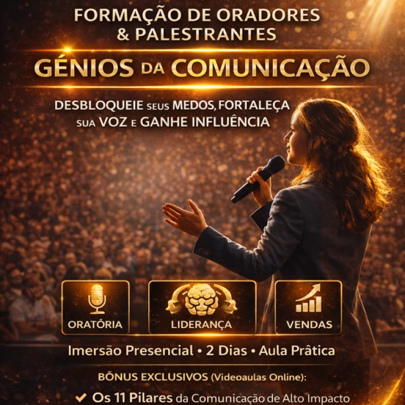 Formação de Oradores e Palestrantes – Gênios da Comunicação - é uma imersão presencial de 2 dias, desenvolvida para quem deseja desbloquear o medo de falar em público, aprimorar a comunicação e se posicionar com clareza, segurança e impacto.